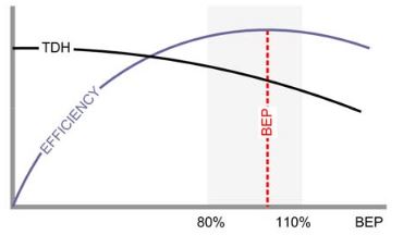 Best Efficiency Point(BEP), the flow rate where a pump has its highest efficiency, is a key factor to assess whether  a pump is being operated properly. Few pumps operate at their exact BEP all of the time, because process variables in a production environment are not 100 percent constant. But a pump that is properly sized for its application will maintain a flow near peak efficiency. Maintaining a flow between 80 percent and 110 percentof BEP is a good range to maximize efficiency and minimize the risk of excessive wear or pump failure.